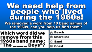 Look forward to questions like "Which word did we remove from this 1960s band name : "The ____ Boys"?" and "Which word did we remove from this 1960s band name : "Ike & Tina ____"?"