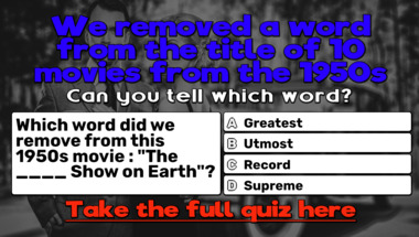 8/10 is the score to beat in this trivia quiz to put yourself over the average quiz taker. But you're probably going to be able to answer questions "Which word did we remove from this 1950s movie : "The ____ Show on Earth"?" and "Which word did we remove from this 1950s movie : "Abbott and ____ Meet Dr Jekyll and .." easy!