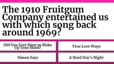 In this fun 1960s Songs quiz we're going to ask questions like "The Monkees entertained us with which song back around 1967?" and "The 1910 Fruitgum Company entertained us with which song back around 1969?".