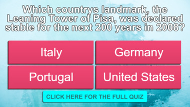Look forward to questions like "What language is spoken in France?" and "Which country's landmark, the Leaning Tower of Pisa, was declared stable for the next.."