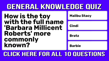 6/10 is what people on average are scoring in this trivia quiz so far. Are you ready to answer questions like "How is the toy with the full name 'Barbara Millicent Roberts' more commonly known?" and "90 Degrees is known as what?"
