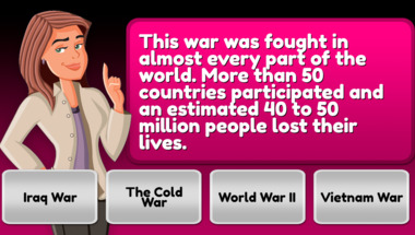 Look forward to questions like "What is the name of the rock at the point where the Mayflower arrived in the USA?" and "This war was fought in almost every part of the world. More than 50 countries partici.."